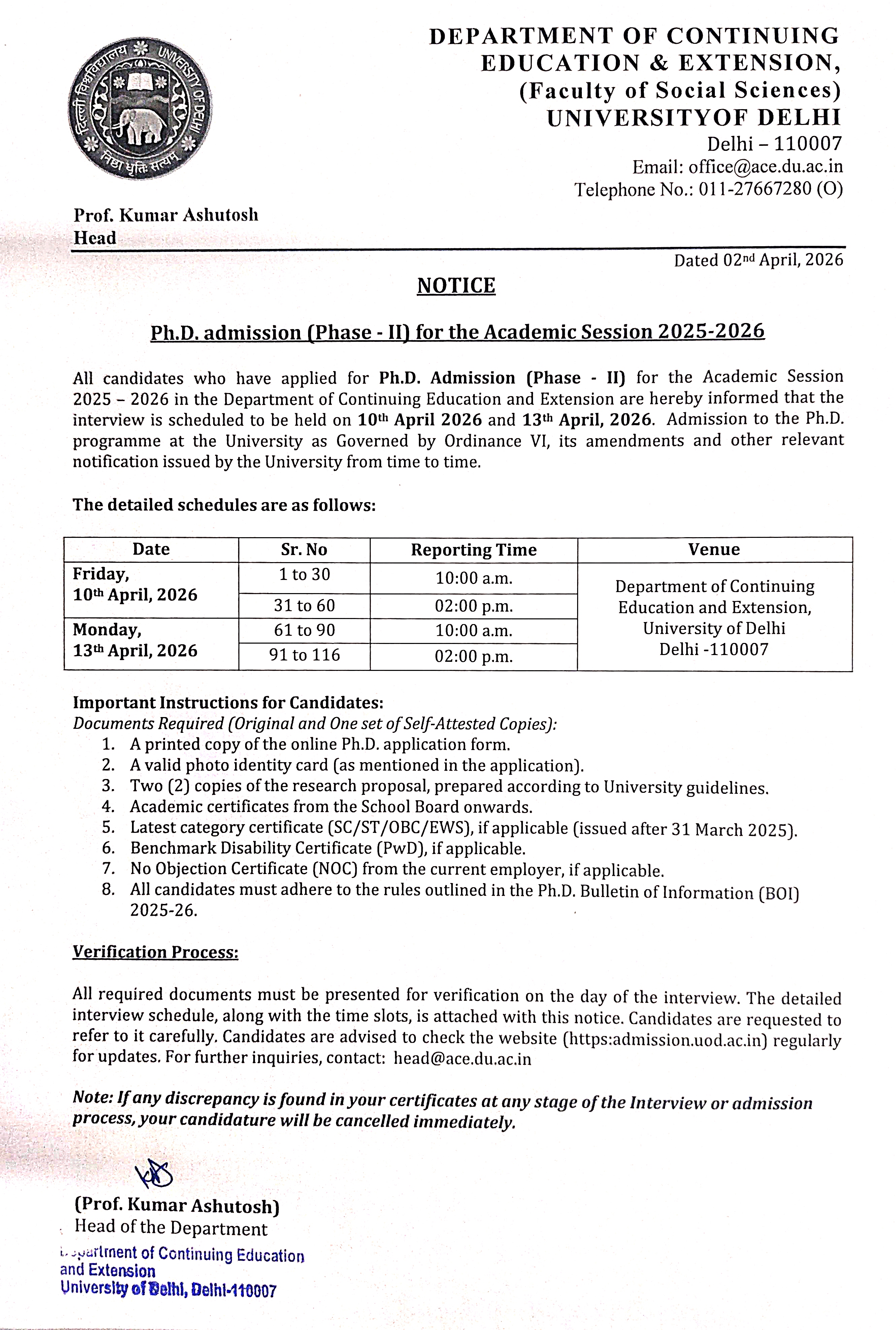 - Corrigendum for Ph.D. Admission (Phase-II) - Department Continuing Education and Extension